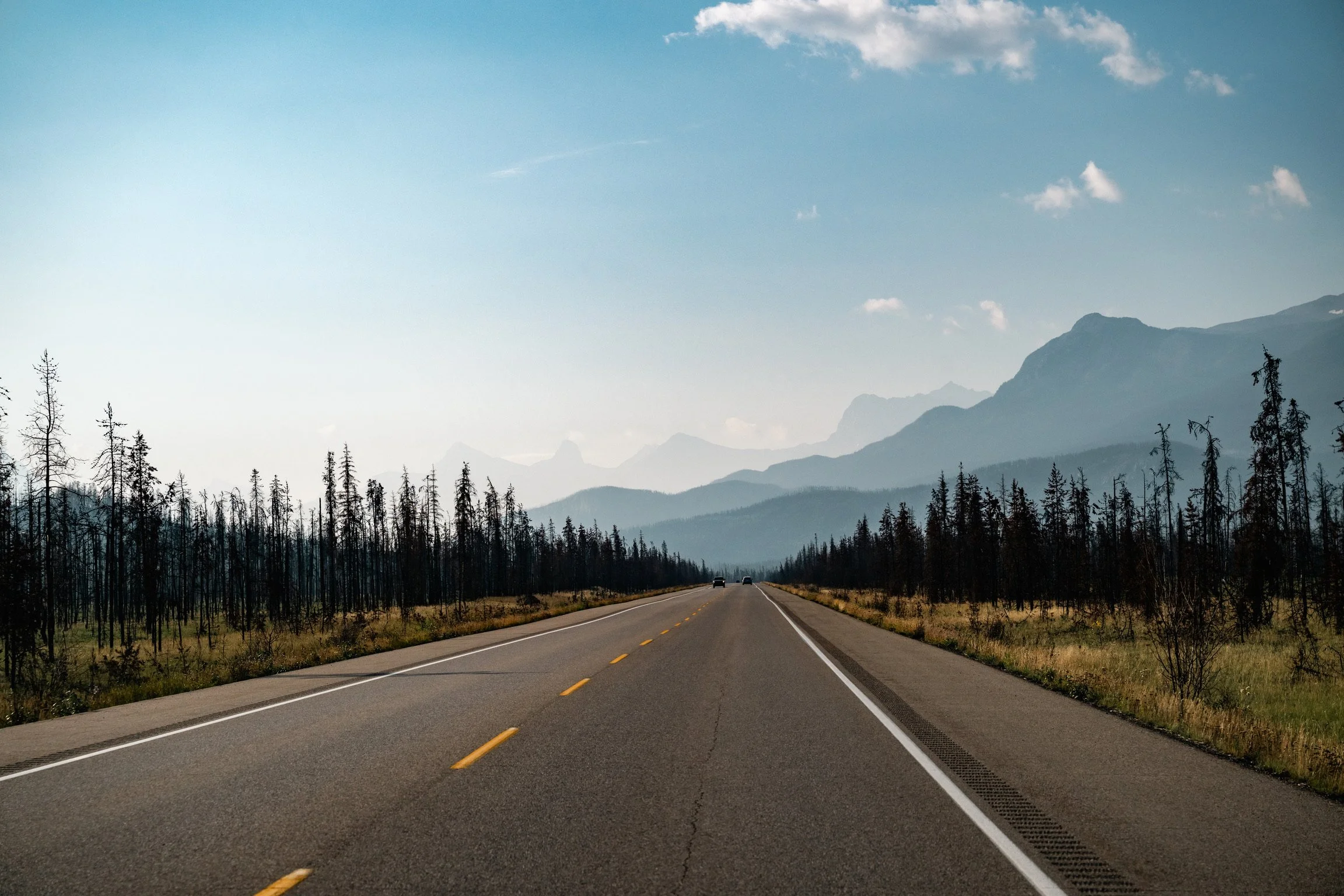 So ein maskulines Ding, anstatt frühstücken erstmal die Axt rausholen? Ach soll er machen. Das Wetter ist grandios gut, die Sicht ebenfalls - perfekte Bedingungen für den Weg durch die Rockies. Wir trinken unseren Kaffee am nahegelegenen Fluss und schauen auf die verbrannte Landschaft. Dann gehts los. Mario fährt die Mambulanz, das steigert meine Laune weil mir keiner in meinen Fahrstil reinquatscht und ich fotografieren kann. Uuund ich habe die Gewalt über die Playlist. Geilo. Schnell noch die obligatorischen Bagles und Croissants und abfahrt. Markise - checked, SlideOut - Checked. Und ab jetzt ist wow angesagt. Das ist was anderes als Dorstener Straße hier und das nicht nur, weil dir hier keine Straßenbahn auf die Nerven geht. Der Blick ist fantastisch. Zunächst noch durchs Wildfiregebiet wird es bald endlich wieder grün.