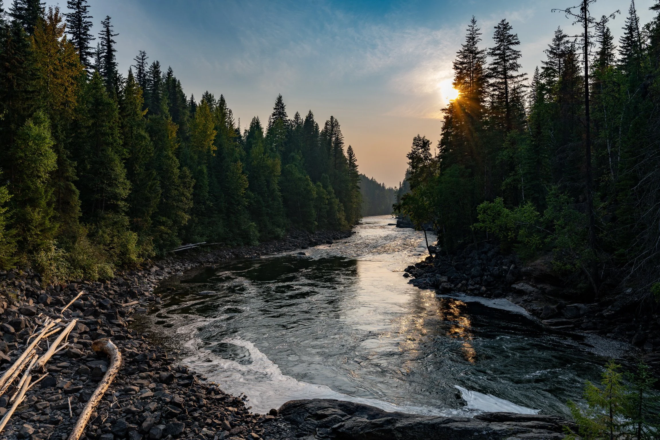 Wir latschen los. 1,5 km Schotterweg, 2km Straße bevor wir am Trailhead ankommen. Ich hab gehört, Wasserfälle lohnt sich vor allem dann, wenn man noch was sieht und die Sonne senkt sich gerade in tiefem rot durch den Wald, während wir uns im Stechschritt dem traumhaft schönen Weg widmen. Es fühlt sich an, als würde man Downhillbiking zu Fuß machen. 4-5 km später hören wir es langsam tosen. Und auch hier ist wieder niemand. Vielleicht lohnt das ganze nicht? Wobei die Dawsonfalls waren auch geil und keiner war da, Theorie schnell widerlegt. Oder bei Dunkelheit durch den Wald ist aus irgendeinem Grund nicht so clever? Noch ist‘s hell. Auch egal. Den Weg, der für 1,5 Stunden ausgelegt ist haben wir in 50 Minuten abgerissen. Das steht auf der haben Seite. Muskelkater morgen bestimmt auch. Und der Blick? So viel vorweg: